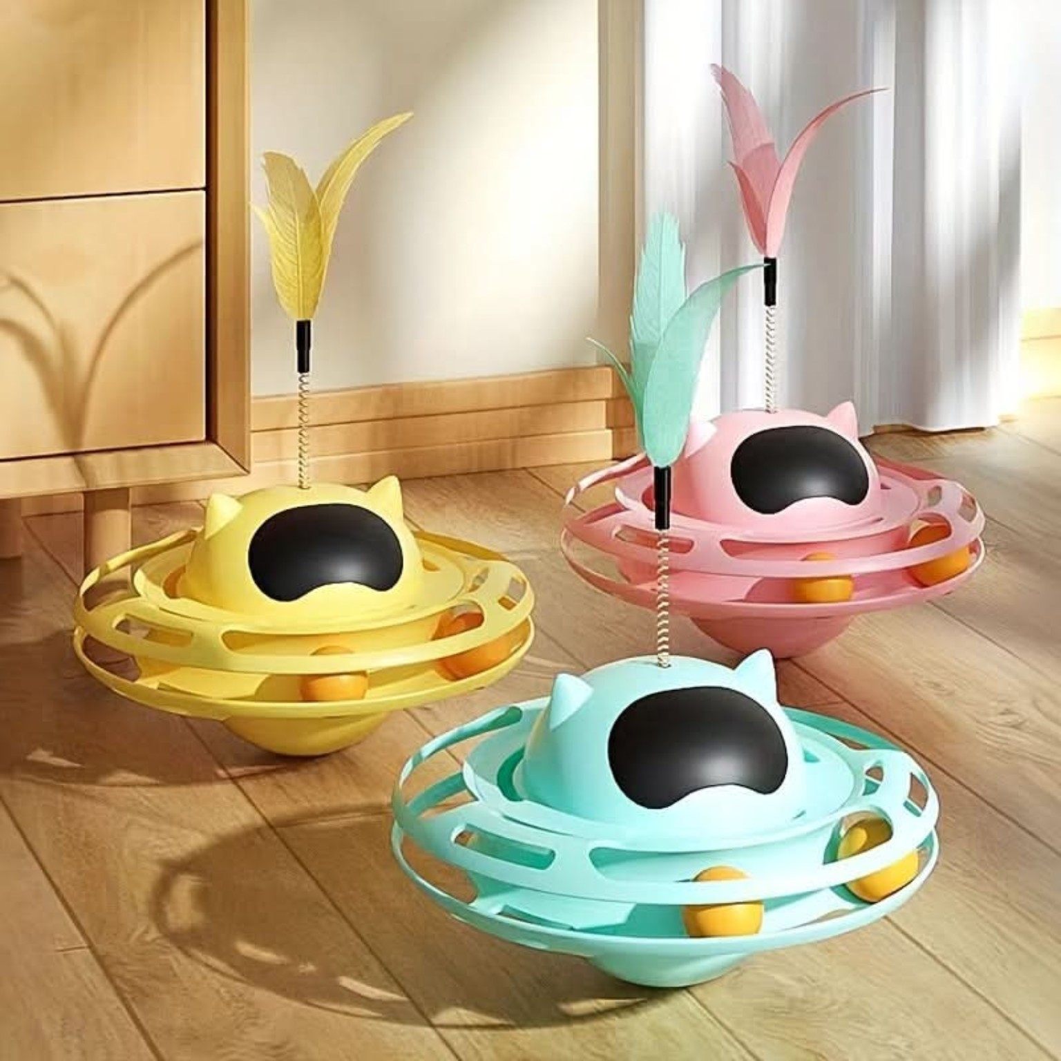 در بالای این اسباب‌بازی، یک پر رنگی و انعطاف‌پذیر قرار دارد که با کوچک‌ترین حرکت، تکان می‌خورد و توجه گربه را جلب می‌کند. این پر، غریزه‌ی طبیعی شکار گربه را بیدار کرده و او را تشویق می‌کند تا با چابکی به آن ضربه بزند، دنبال کند و بپرد. در قسمت پایینی نیز چند توپ رنگی درون یک ریل دایره‌ای حرکت می‌کنند؛ هر بار که گربه به اسباب‌بازی ضربه می‌زند، توپ‌ها می‌چرخند و صدای خفیفی ایجاد می‌کنند که اشتیاق گربه را برای ادامه‌ی بازی دوچندان می‌سازد.
